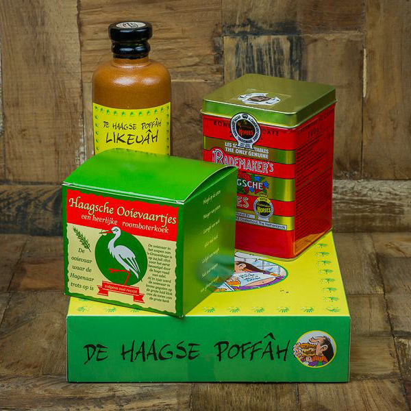 Haags pakket gevuld met diverse Haagse specialiteiten. Het pakket bestaat uit een kleine Haagse Poffâh, een blikje Haagse hopjes, Haagse ooievaartjes en een flesje Haagse Poffàh likeur. Erg leuk als cadeau, maar ook als relatiegeschenk.